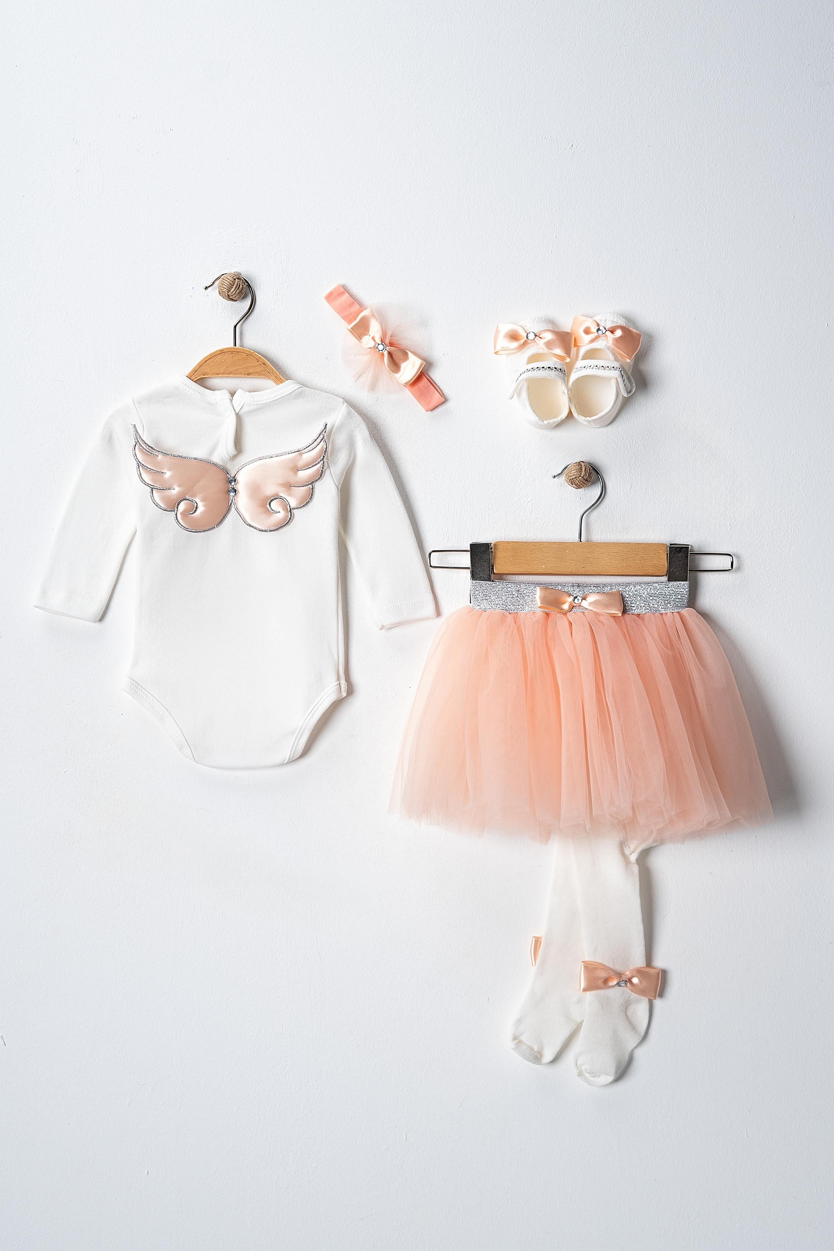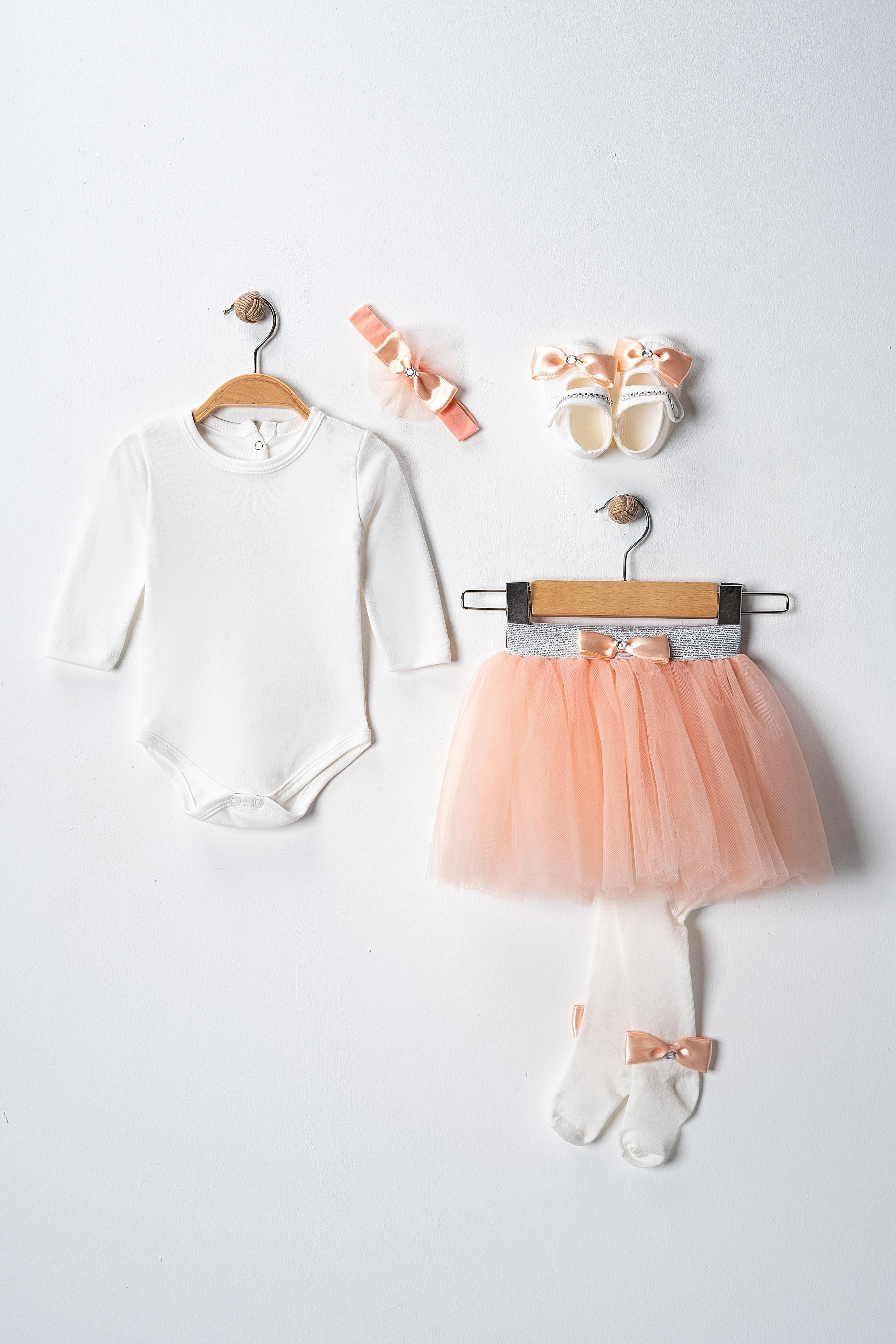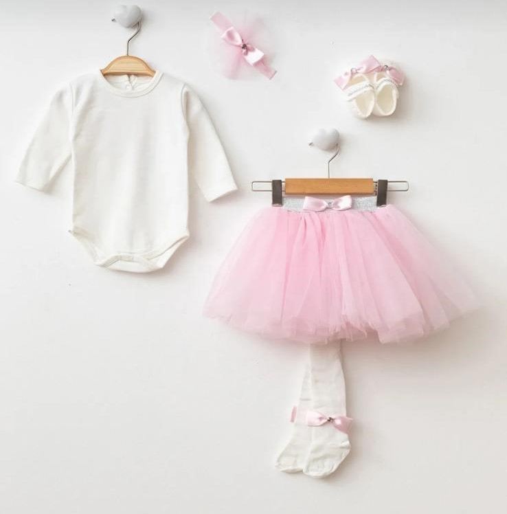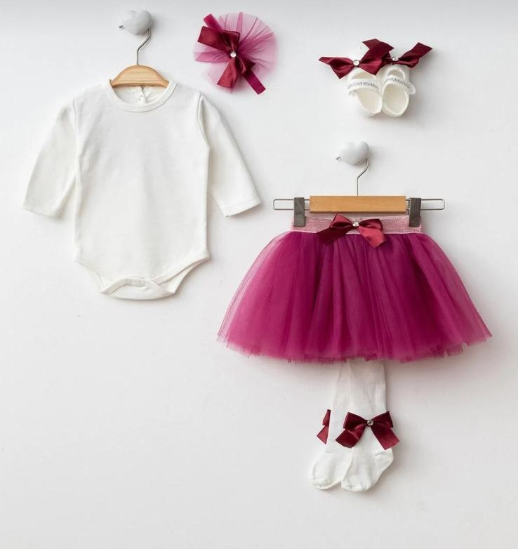 Set içeriği; tütü etek, body, saç bandı, çorap ve ayakkabıdan oluşmaktadır. Pembe, somon ve vişne rengi olmak üzere 3 farklı renk seçeneği mevcuttur.